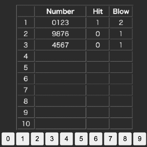 ヒット・アンド・ブロー:隠された0~9の数字を推理するゲーム Hit/位置と数字が正解、Blow/数字のみ正解